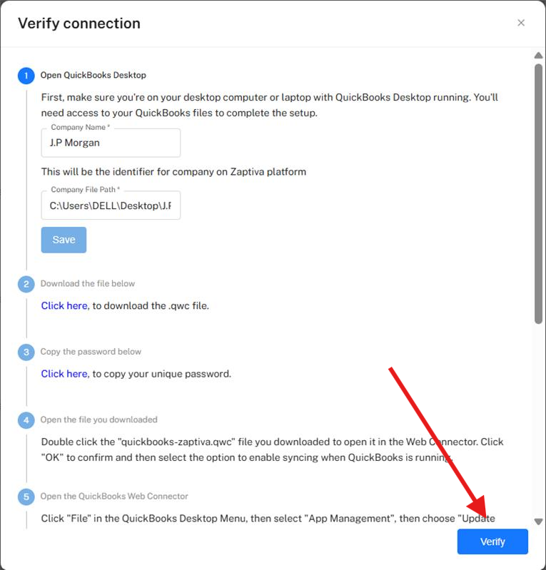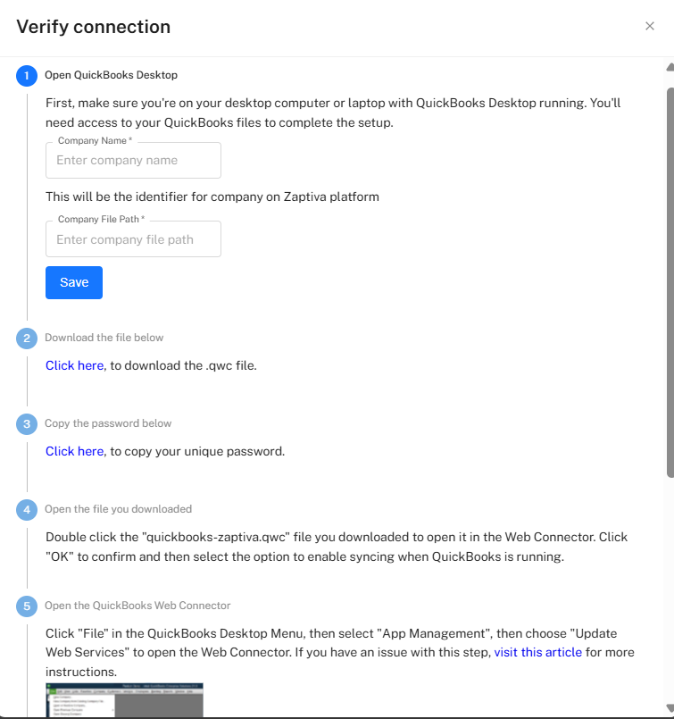 To complete the connection from Zaptiva to QuickBooks using the QuickBooks Web Connector (QWC), please follow the steps below.