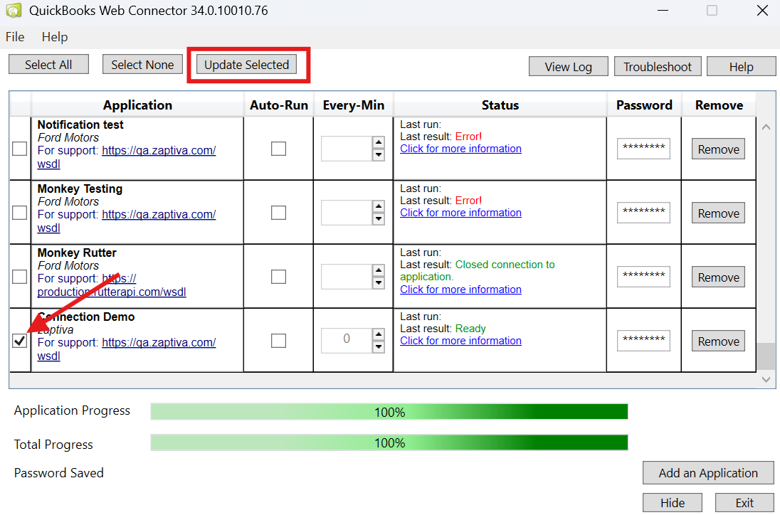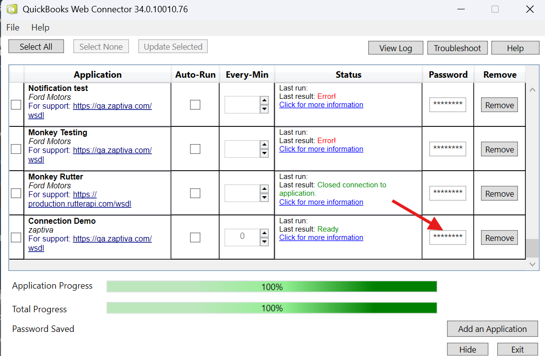 - Open the QuickBooks Web Connector, and enter the QWC password noted in a previous step (Connect: Step 4)