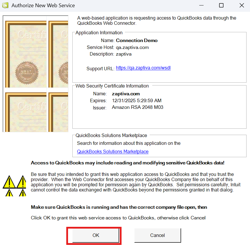 - After selecting the .qwc file, following prompt will appear: Click "OK"