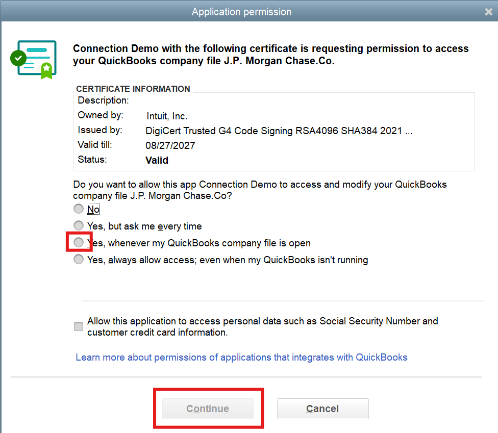 Go to QuickBooks Desktop, the "Application Certificate" page appears, select “Yes, Whenever my QuickBooks company file is open” and then click "Continue..."