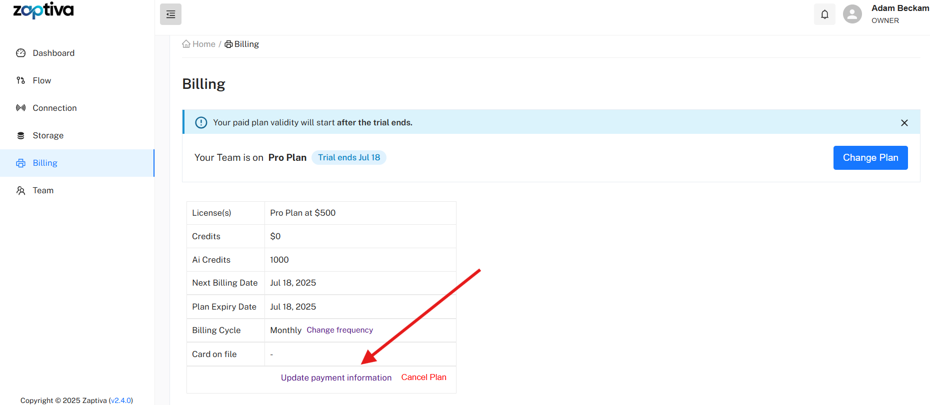 - To update your payment info, click 'Update Payment Information' on the Billing page.