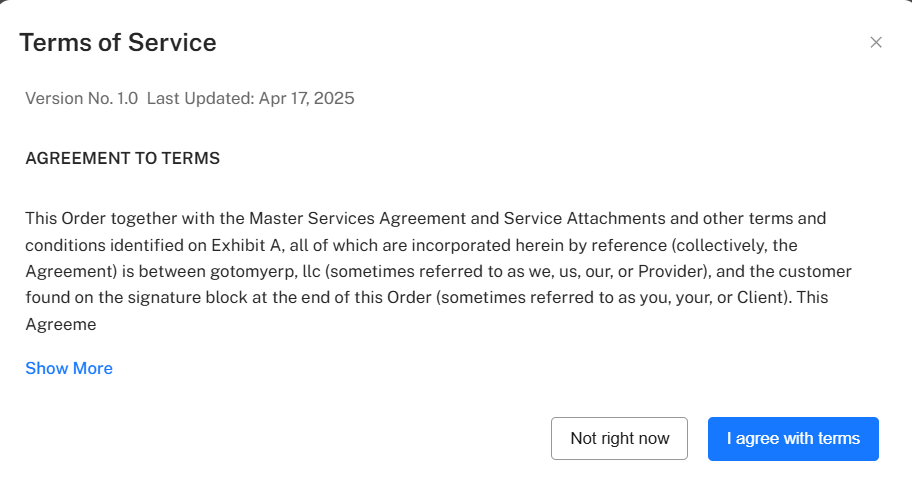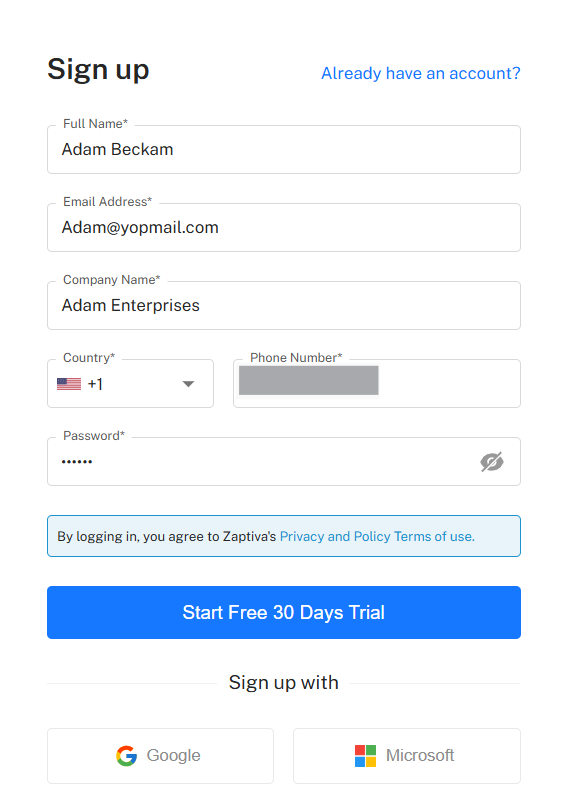 Enter all necessary details and click on "Start Free 30 Days Trial". A 'Terms of Service' popup will appear.