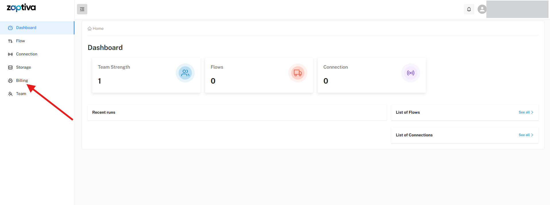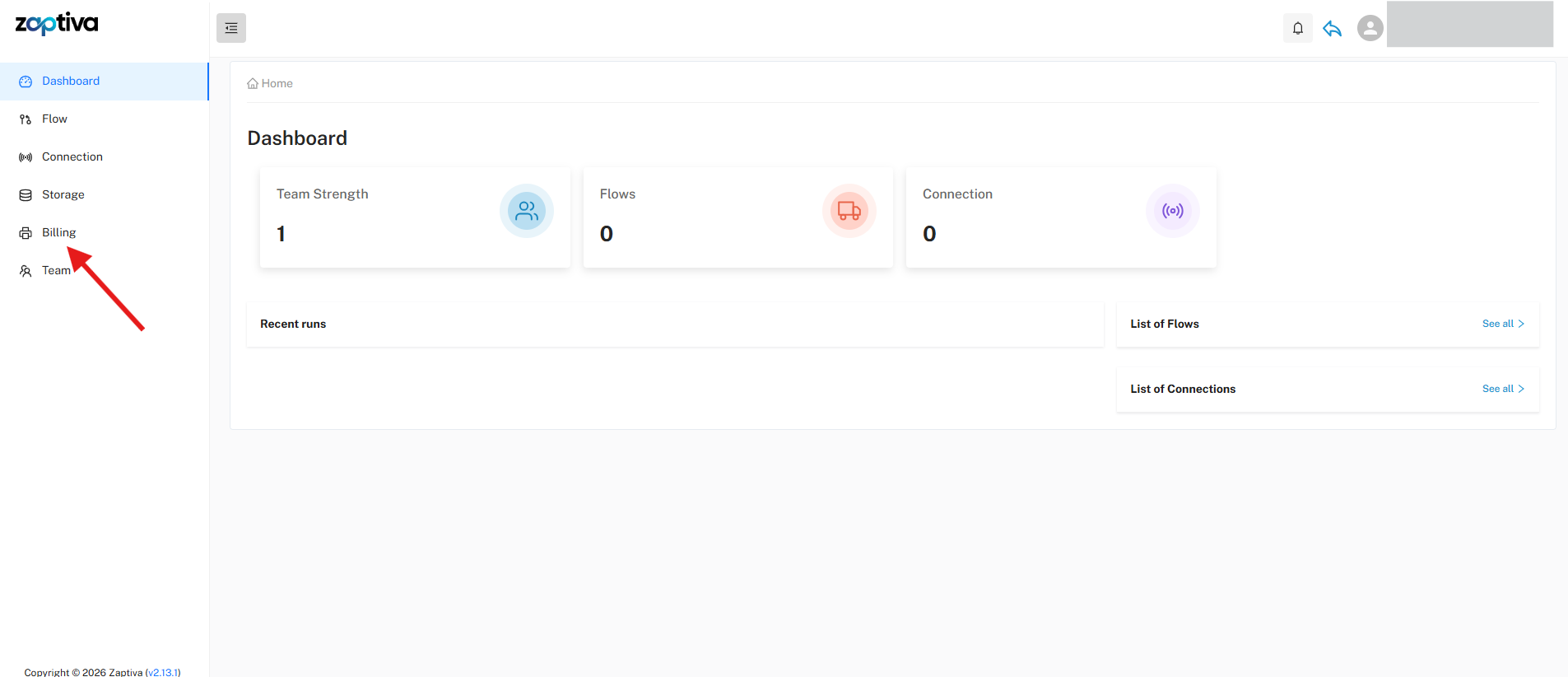 1. On Zaptiva, click on Billing from the left-hand menu. You will be redirected to the Billing page.