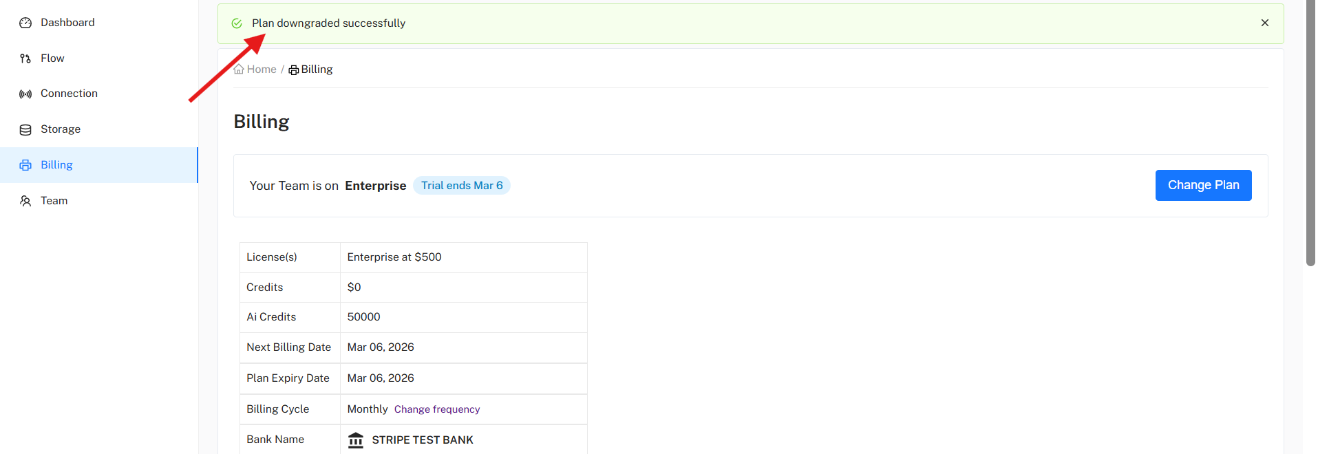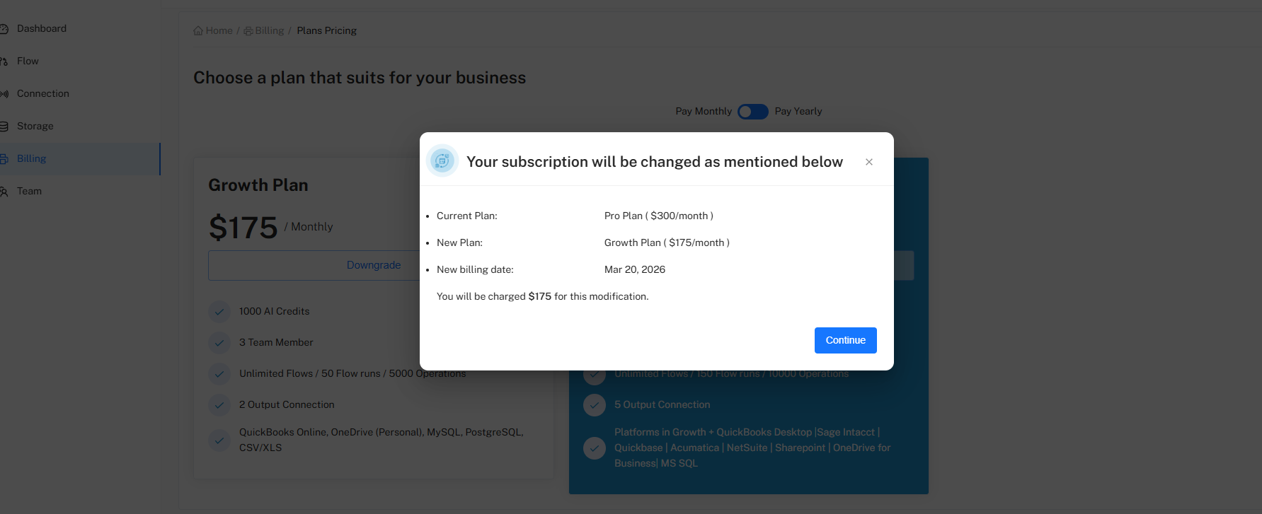 “Continue” button to confirm the change. Once completed, you will be redirected to the Billing page, and a confirmation message —