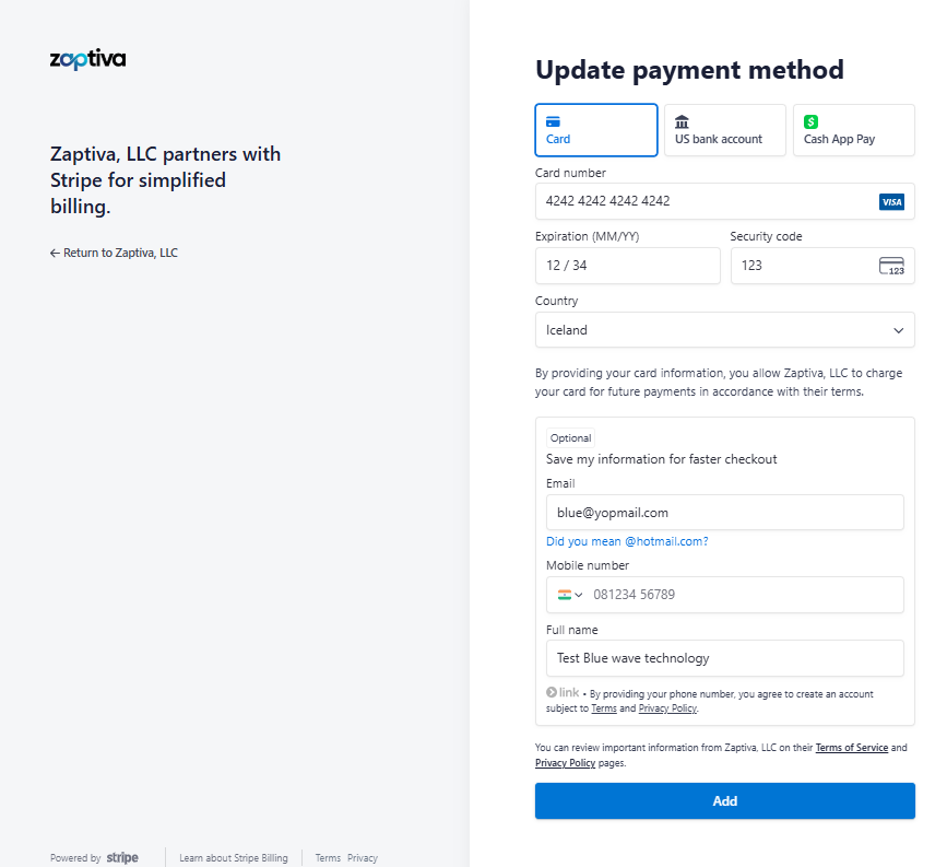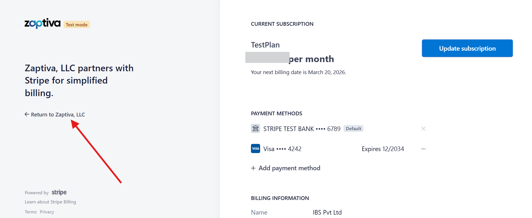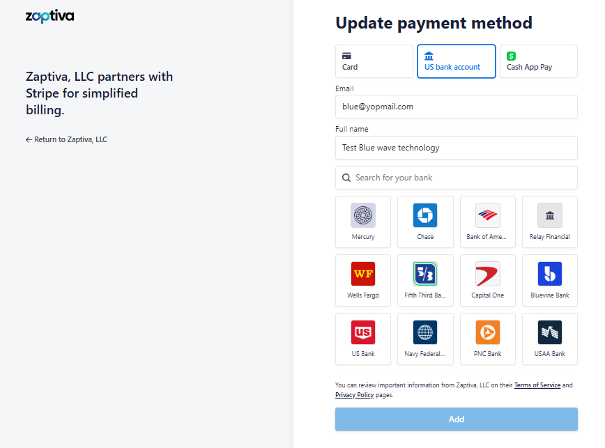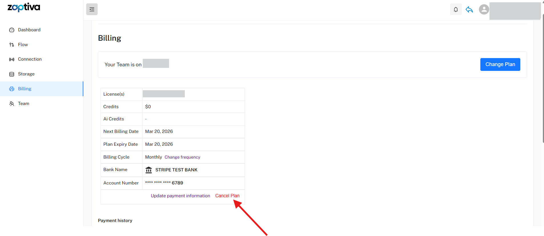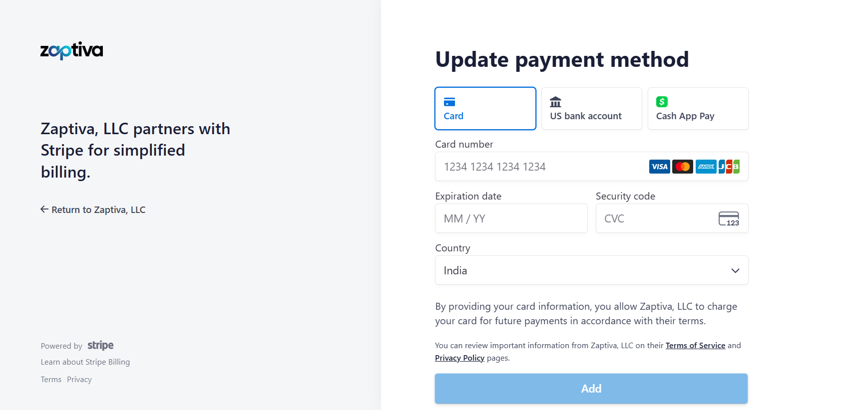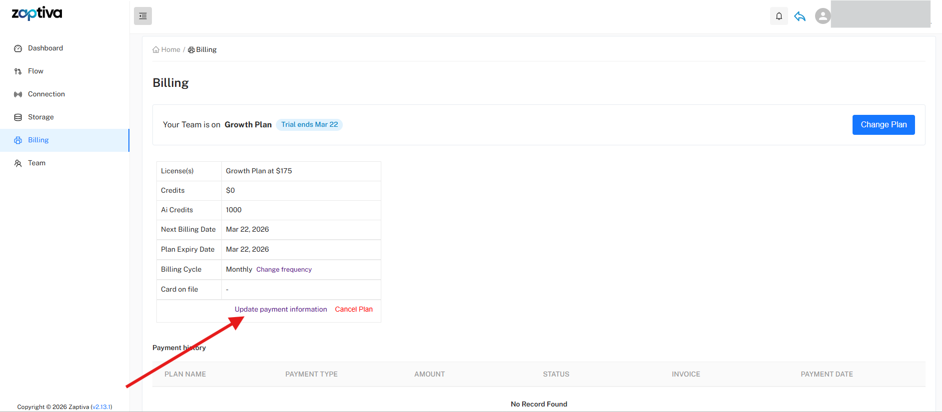Follow the steps below to manage Billing & Payment Methods in Zaptiva: