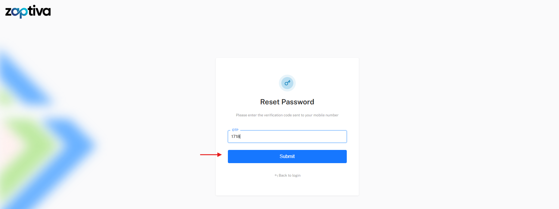 6. Enter the OTP sent to your registered mobile number (valid for 15 minutes) and click Submit to proceed with resetting your password.