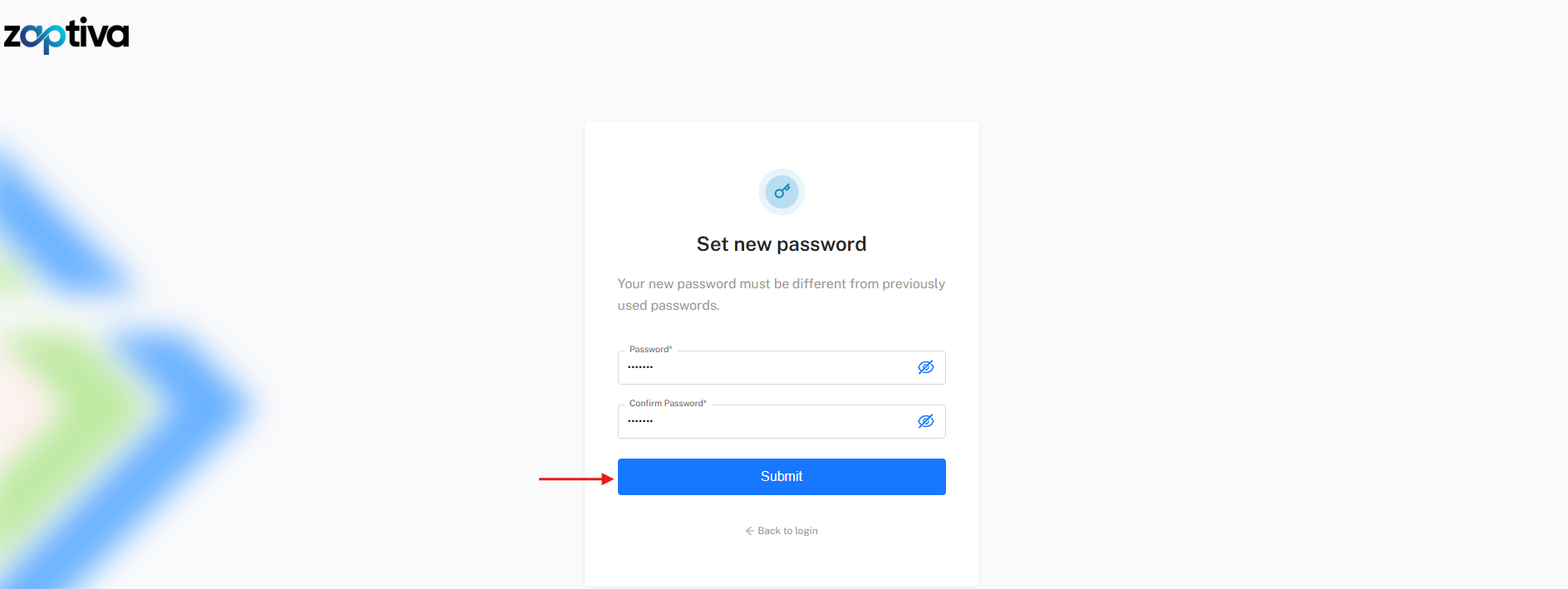 7. Enter and confirm your new password (must be different from your previous password), then click on "Submit".